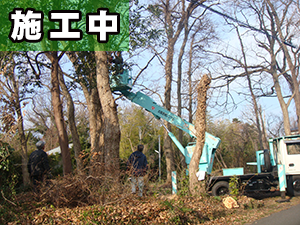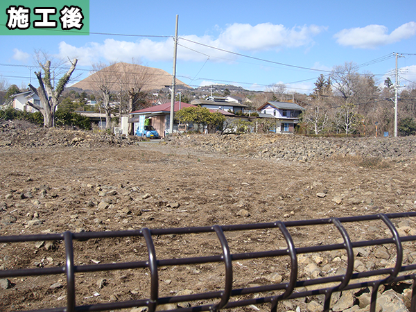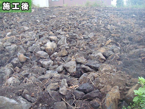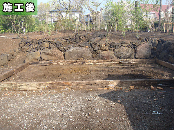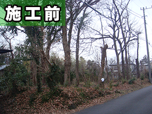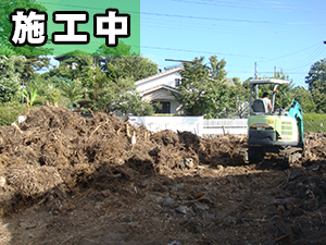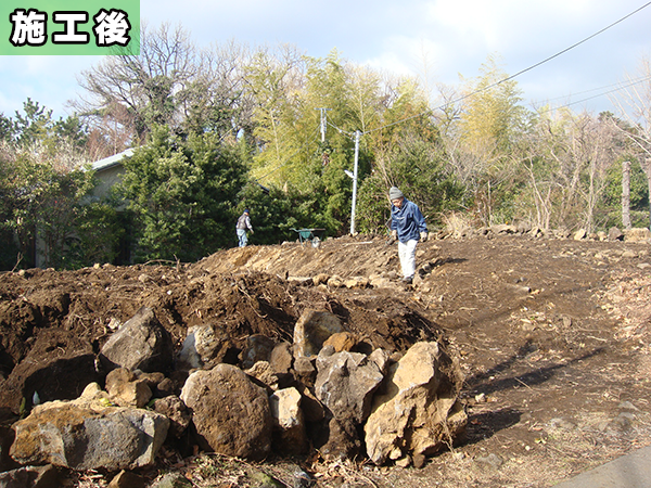 伐採伐根 伐根工事1 5割が高木のクヌギ、雑木が3割、竹が2割の伐根作業でした。竹の根がお隣の塀をもぐり浸入したため竹の新根には注意し処理しました。 伐根工事2 石が多く、クヌギ、ヒメシャラ、カラスザンショウ等の高木の根がボク石にからんでいるのが大半でした。 伐採工事1 クヌギ、コナラ、モミの高木を伐採。高いのではGLから25m程ありました。近隣に枝が浸入していた為、重機の配置、枝の落とし方には注意しながら作業をすすめました。 造成工事1 高木・低木伐採伐根後、造成にとりかかりました。お客様の要望でコストがかからないように造成後、簡易的にボク石を並べて欲しいとのことでした。石の目地、客土入れなどは、お客様が花を植えながら作業するとのことでした。